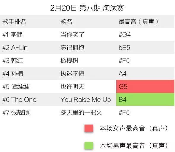 在第八期节目中,The One和谭维维分别唱到了当场男声最高音和女声最高音,他们分列第六名和第五名。