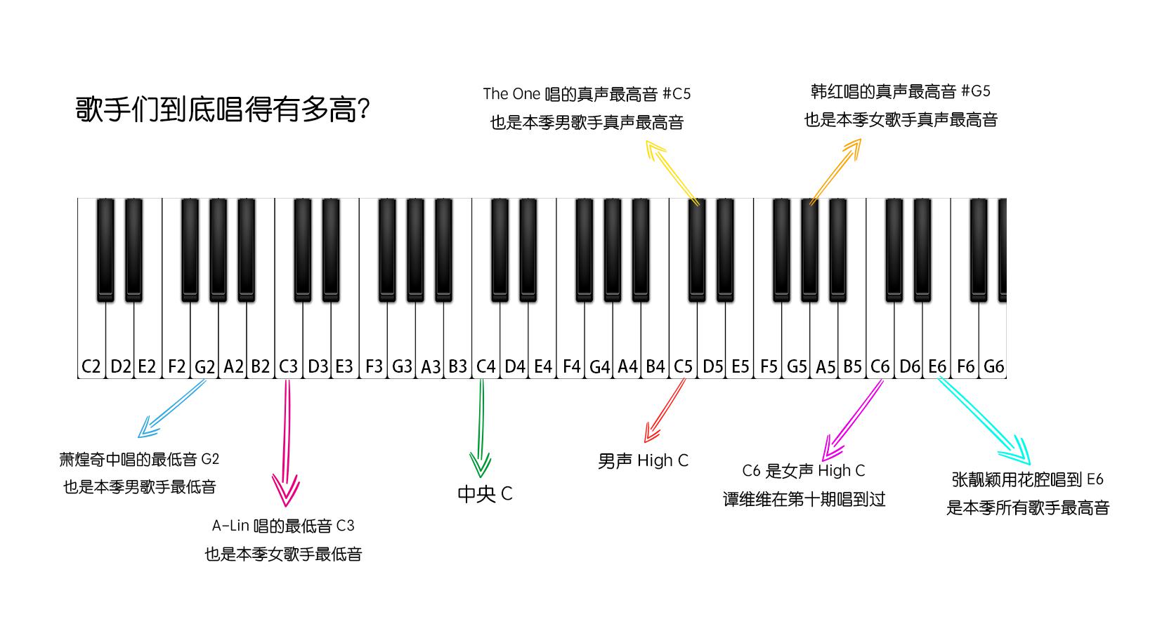 《我是歌手》从第一季开始就被一些网友“吐槽”这是个高音选手炫技节目。演唱音域跨度不大的歌手很难拿到好成绩。高音的确能展示一个歌手的实力,强劲的高音能够让歌手在现场表演中容易出彩。本季歌手中:韩红和孙楠是高音暴发户,几乎每场都会唱到很高;谭维维(微博)在第十期中花腔唱到C6(女声的High C),而张靓颖(微博)在第六期节目中花腔唱出比High C还要高两个全音的E6;胡彦斌(微博)(微信号:hu-yanbin)和The One都在竞演中唱到了C5(男声的High C)……