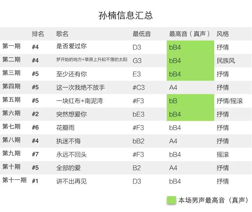 而另外一位高音唱将孙楠,在十一场竞演中也有五场唱到了本场男声最高音,但这五场他都没有拿到冠军。