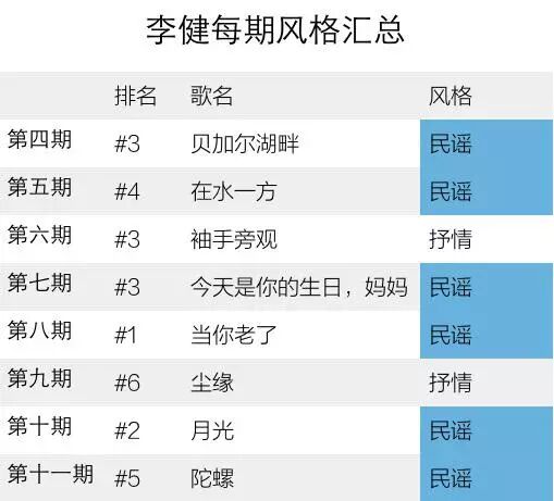 再来看看李健的数据,如下图。在我们的印象中李健是一位特别钟爱民谣的歌手,他在《歌手3》中8场竞演中唱了6首民谣曲风的歌曲,而他每次唱民谣名次都不会太靠后
