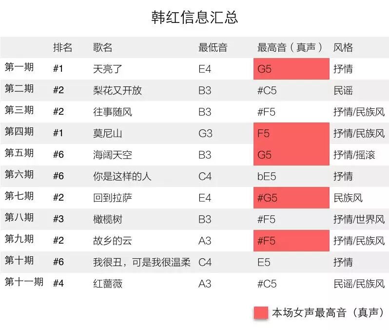 众所周知,韩红是飙高音的好手,而她在十一场的竞演中,有五场唱到了本场女歌手中的最高音,但是只有其中两场拿到了冠军。