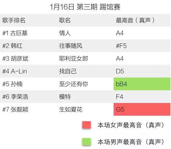 如下图,在第三期节目中,孙楠和张靓颖分别唱到了当场男声最高音和女声最高音,他们分列第五名和第七名。