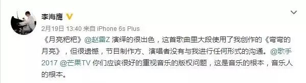 继迪玛希演唱《歌剧2》被维塔斯发出侵权警告、张杰翻唱《默》被高晓松指出未经授权后,湖南卫视《歌手》节目再一次未经授权使用他人音乐作品。词曲作者李海鹰连续发文指责湖南卫视《歌手》节目侵权。李海鹰称:“《月亮粑粑》@赵雷Z 演绎的很出色,这首歌曲里大段使用了我创作的《弯弯的月亮》,但很遗憾,节目制作方、演唱者没有与我进行任何形式的沟通。@歌手2017 @芒果TV 你们应该很好的重视音乐的版权问题,这是音乐的根本,音乐人的根本。”