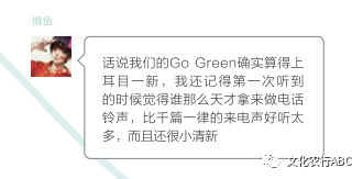 经积木鱼乐队配乐演唱,《GoGreen绿色农行》于 2013 年 9 月 14 日绿色生活节上首秀,收获了现场观众及客户真诚赞赏。作为一首源起传播企业品牌形象的歌曲,她既代表了企业的趋向,又兼顾流行音乐元素。问世三年多来,传唱越来越广,已渐渐成为一首经得起时间考验的经典曲目。