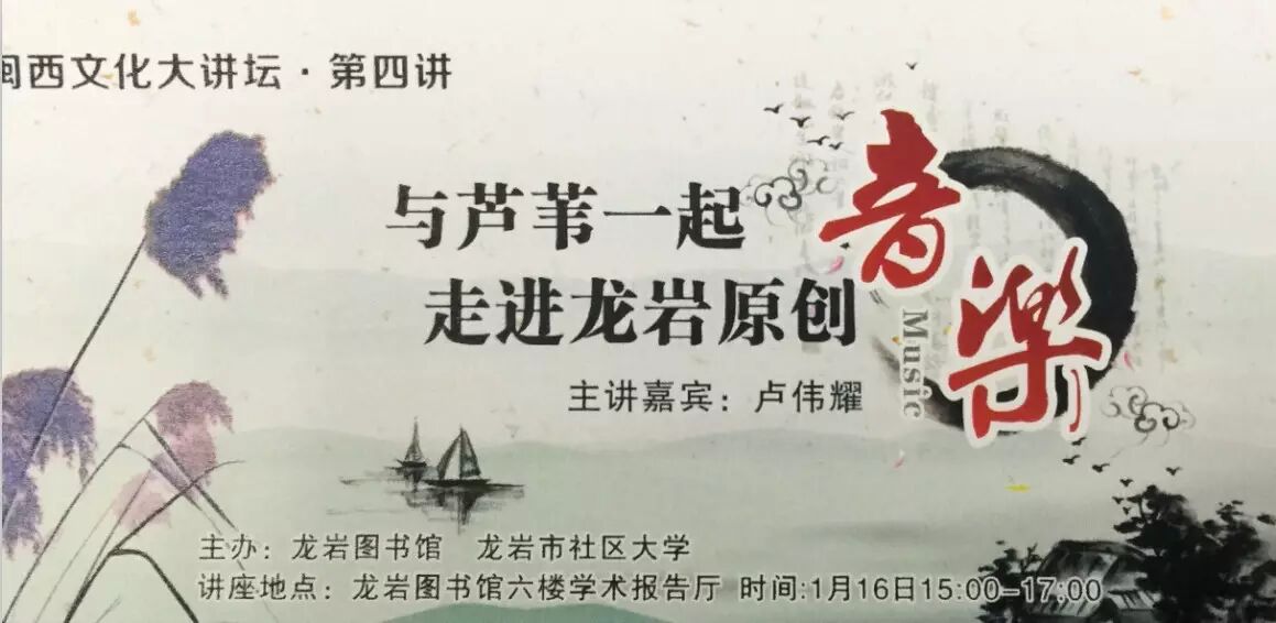 2016年1月16号下午3点-5点,闽西文化大讲堂第四讲《与芦苇一起走进龙岩原创音乐》讲座将在龙岩图书馆的6楼报告厅开讲。