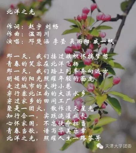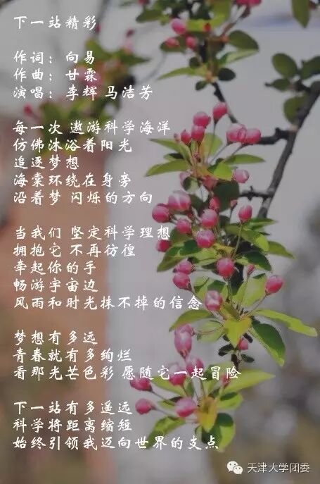 同学们还记得我们的120周年校庆晚会校园原创歌曲联唱备选曲目投票活动吗?通过大家的参与,获得票数最多的三首歌曲分别是《海棠花开》、《下一站精彩》、《北洋之光》。在10月2日晚举行的天大120周年校庆晚会上将有演员带领观众一同唱响这三首歌曲,想想万人同唱的场面就很激动呢!话不多说,我们一起来回味一下这些歌曲吧! 小青媒倡导:大家可以多听听,学着唱一下,这种在校庆晚会上和朋友们一起唱歌的机会可不多哦~■ 图文来源 | 天津大学新青年媒体中心
