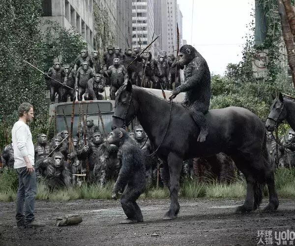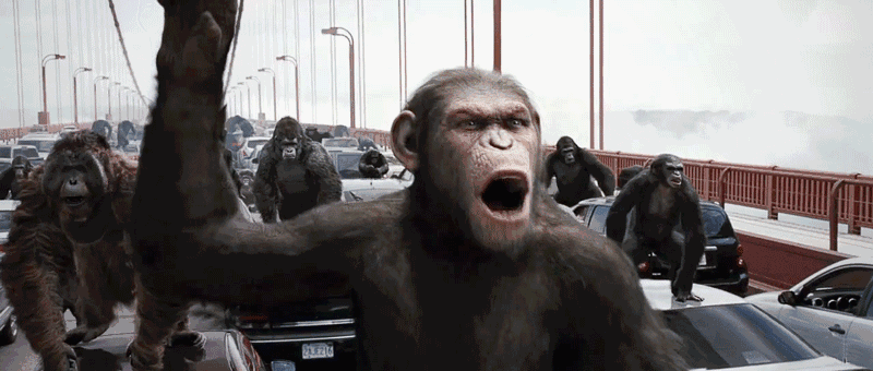 被囚禁的猩猩们越狱了,他们在旧金山大桥与人类进行了第一场战争。凯撒一声怒吼:“Noooo!”标志着地球上第二个智慧种族的诞生,一群高智商的猩猩与人类对立的战争就此拉开。