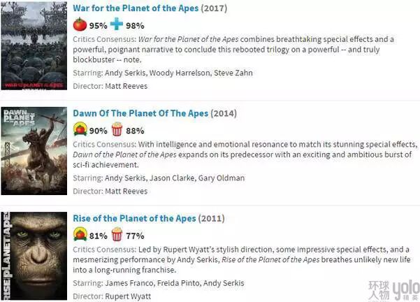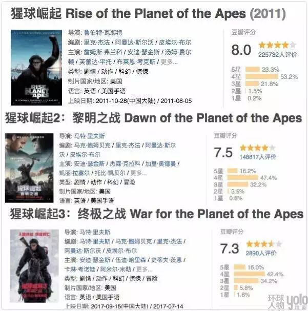 《猩球崛起3》在国内的网络评分,不难发现国内对三部曲的喜爱程度呈递减趋势。