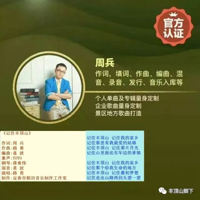 《记住丰顶山》,唱响丰顶山,唱响我们自己。让歌曲抒发出我们的乡愁、让歌曲唱出我们的自信、让歌曲传播丰顶山的风光美景。让我们、让大家、让我们后代祖孙都能记住丰顶山。