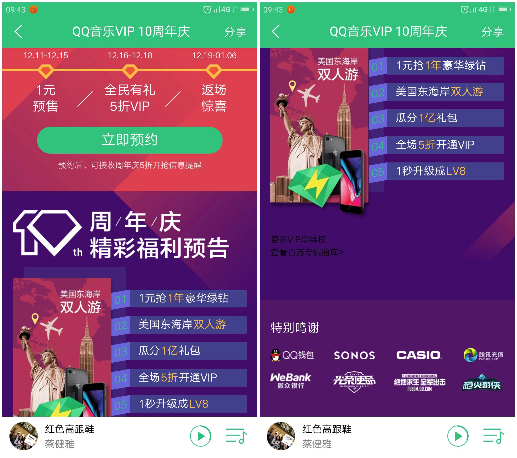【活动介绍】1.所有用户可在预售时间内支付1元购买预售卡;2.成功购买预售卡的用户可在12月16日周年庆主会场参与随机抽取7天~1年绿钻豪华版,100%获得;3.活动分三个阶段,1元预售-全民有礼-惊喜返场,总共持续时间约为25天;3.周年庆精彩福利预告,放出周年庆五大福利;4.展示VIP特权及QQ音乐百万专属曲库;5.添加特别鸣谢,与各大项目连诀出演。