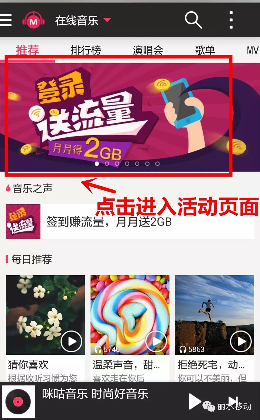 小伙伴们下载并注册登录咪咕音乐客户端,点击首页活动入口按照指引完成签到,即可获赠流量!
