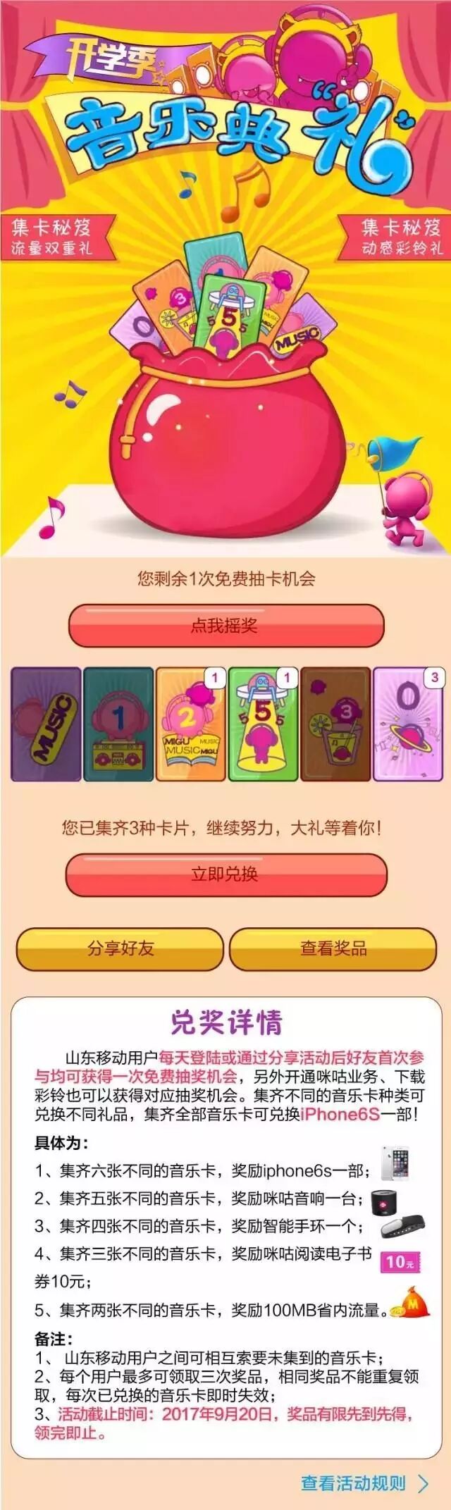 2、本活动仅限山东移动个人用户参与,受活动规则限制,行业应用卡、物联卡,数据卡,信息机等用户无法参与活动。