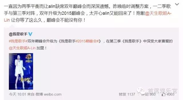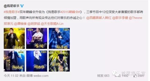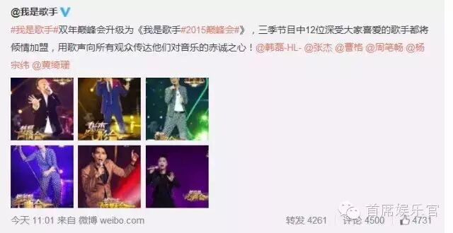 首先,@我是歌手 官微在中午连续发布两条微博,公开了此次《我是歌手#2015巅峰会#》的歌手阵容: