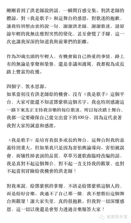 可以说微博初衷不是针对邓紫棋,发出后又跟众歌手进一步沟通大家一致作出了按节目要求换歌的调整,但我们又面临了邓紫棋也需要考虑换歌的现实,因为这样一来,全场将只有早前已应允的邓紫棋一人演唱自己的个人作品,我们将无法面对其他六位最终选择换歌的歌手的质疑。情势的变化让我们不得不考虑推翻之前的应允,我本人在向公司负责人、歌手表达了深深的歉意后,希望公司能理解节目组的苦衷劝艺人临时换歌。