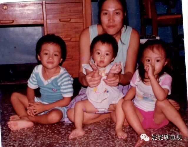 (全家福,爸爸拍照,1周岁的她坐在妈妈腿上,哥哥姐姐在左右)