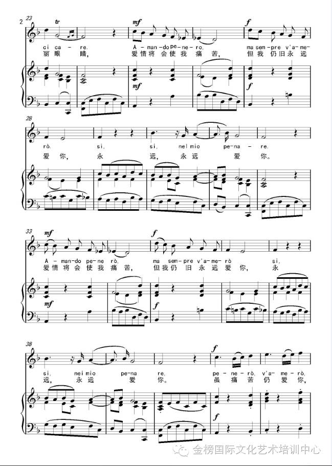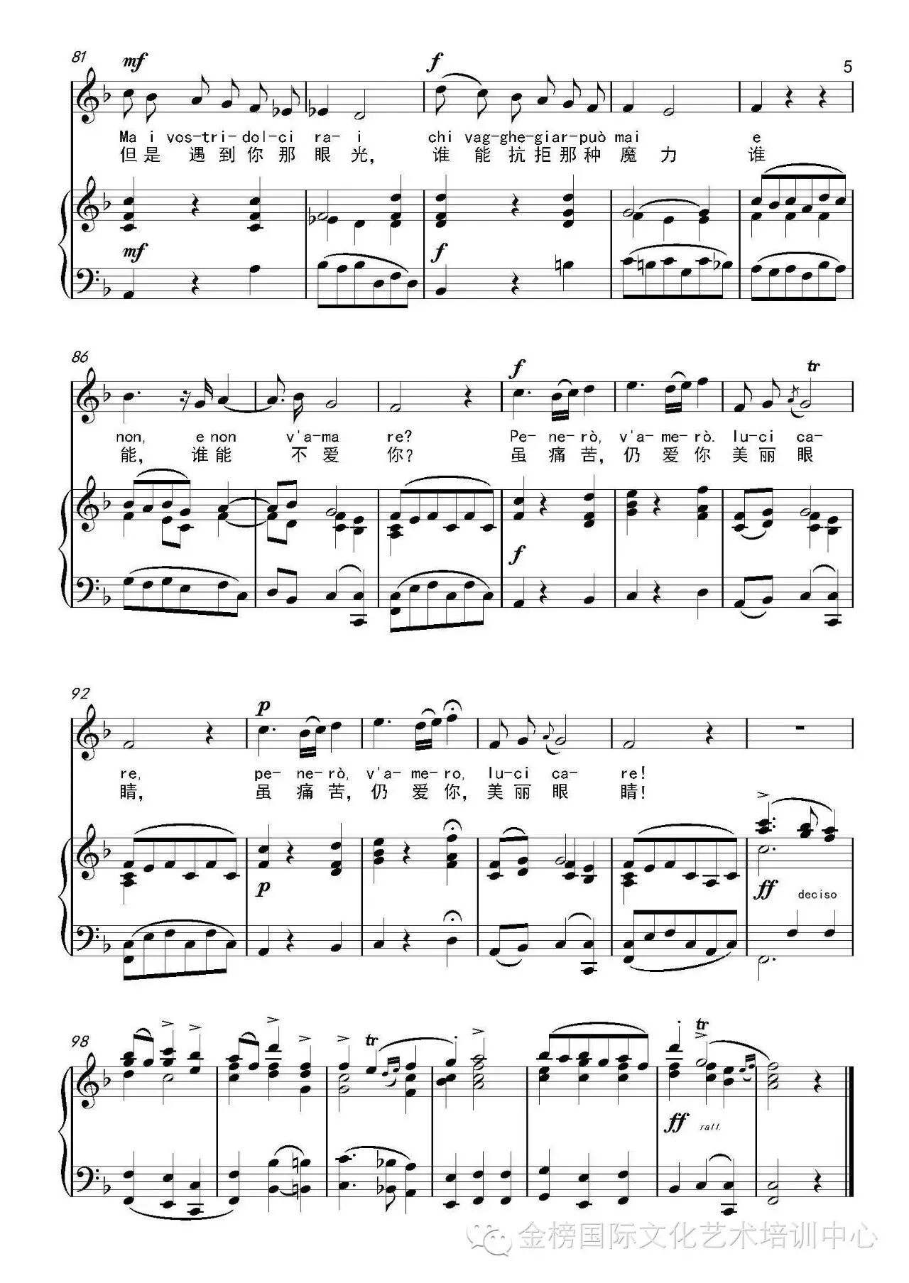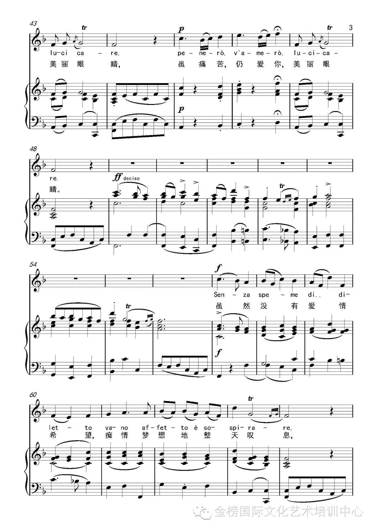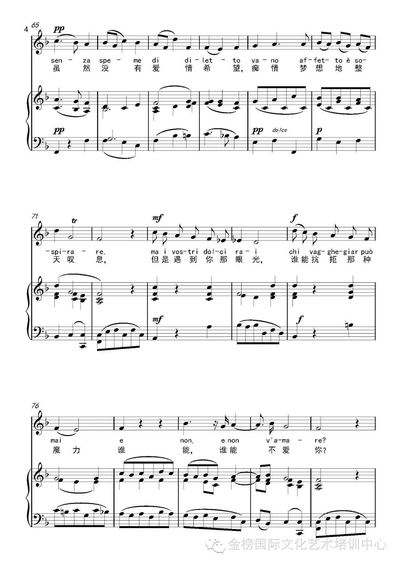 每当你唱一首曲子,要记住所唱歌曲的全名、作曲家的名字及歌曲的时代背景。这首曲子的题目也可以翻译为“多么光荣能爱你”。在那个时代(包括亨德尔及亨德尔以前的作品)是没有延长记号的,结尾都是逐渐拉开,不管怎样拉慢,总是在一个合理渐慢的状态上进行的,再拉宽拍子也是有节奏的拉宽。这支曲共两段,每段最后都有两个一样的重复句,即Penerò,Vamerò,Luci Care......第一次的Penerò的(第41小节-44小节),不要有意识地拉得太慢,可以唱得比现有进行的节奏稍慢,但不要拉得太宽。第二段的两句中第一次是f(第89节),第二次是p(第93小节),有p处可把拍子拉宽而且在逐渐拉宽。