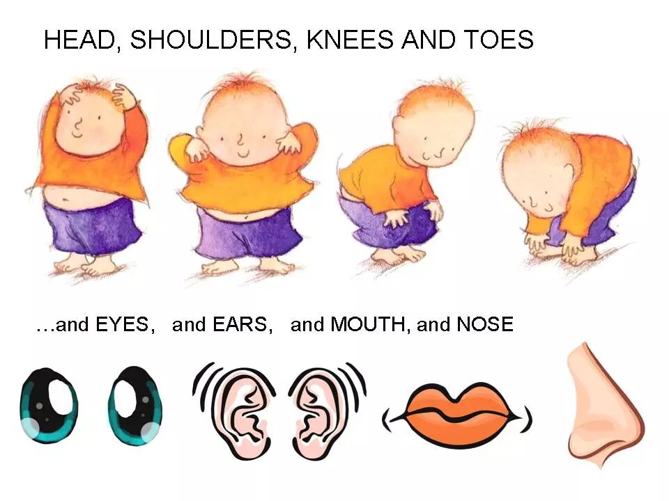 这是一首非常简单的身体认知歌,其实歌词只有两句,分别教小朋友认识了身体的头、肩膀、膝盖、脚趾,和脸部的眼睛、耳朵、嘴巴、鼻子。现在一岁半的大N把这首歌跳的乱七八糟,比如让他蹲下时他反而喜欢跳起来,更别提让他指眼睛鼻子时更是乱摸一通。但是我还是很喜欢带着他跳这首歌,除了不放弃教大N认知身体以外,还有个原因是因为对于这个年龄段的孩子熟练屈膝下蹲还是个需要练习的动作,这首歌去摸脚趾的动作刚好可以锻炼到这个点。嗯,还有,跟大N唱跳这首歌气氛每次都会很欢乐!