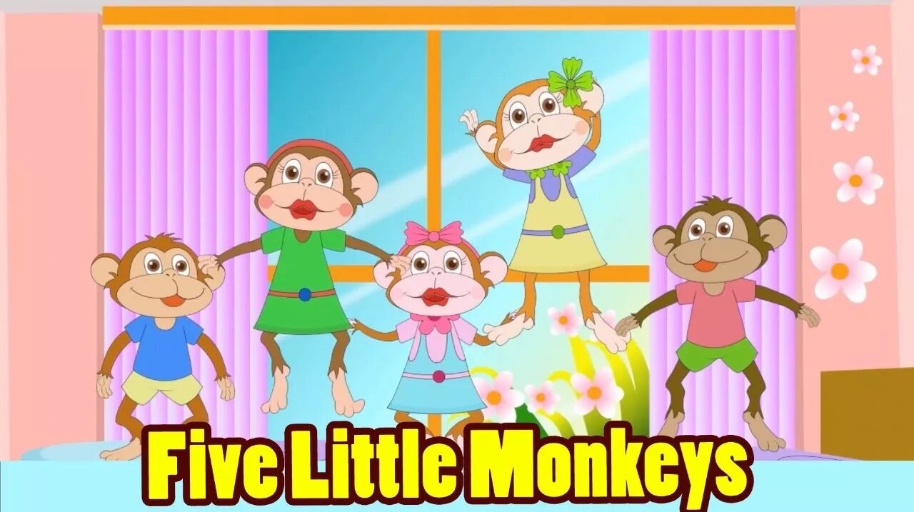 这是我个人非常喜欢的一首旋律,用这个曲,填了不同词的儿歌有很多首。这首说的是5只小猴子在床上蹦蹦跳,一只一只地从床上掉下来,头上撞了大包,猴妈妈给医生打了电话,医生说小猴子们不能再在床上跳啦。这是一首非常棒的1-5英语数字学习歌,孩子们也对多到少有了具象的概念。这首歌非常适合边唱边跳,我都是和小M拉着手一起先原地跳跳,然后假装摔倒在地,揉揉自己的额头,然后做出打电话的样子,这时,通常小M会跟着我一起打电话。插个题外话,小M超喜欢打电话,任何物品在她手里都能作为电话,大至包包,小至水果片