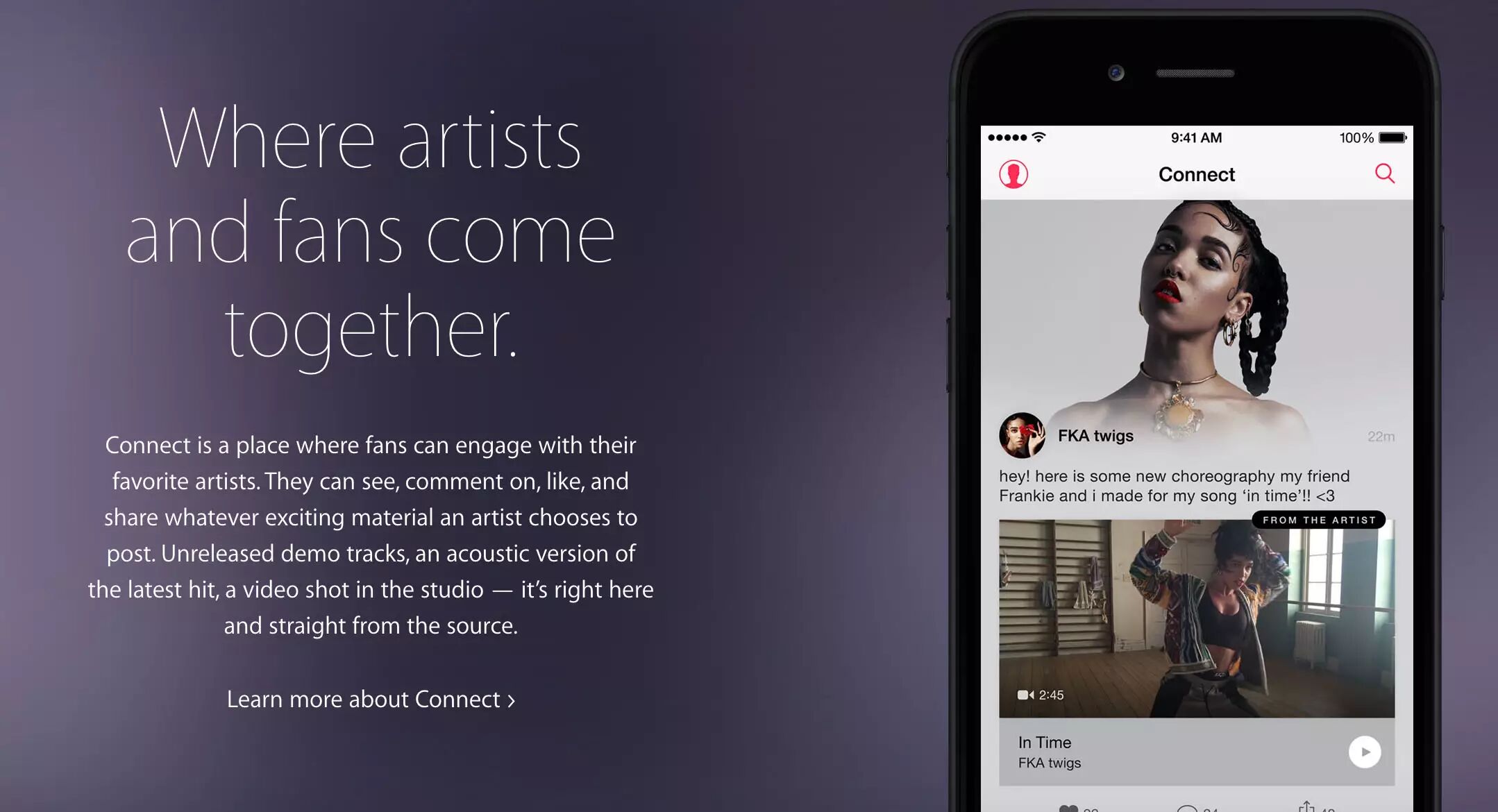 另外一个大的变化是,Apple Music 加入了音乐人和粉丝互动的平台。这在整个 Apple Music 应用里占据了下方的第四个 Tab。和之前的传闻基本吻合,这次的社交元素和苹果曾经尝试过的 Ping 不同,只有艺人能够生产内容,歌迷只能在艺人的内容下点赞、评论。与其说社交,这更像一个给艺人增强与歌迷互动的方式。