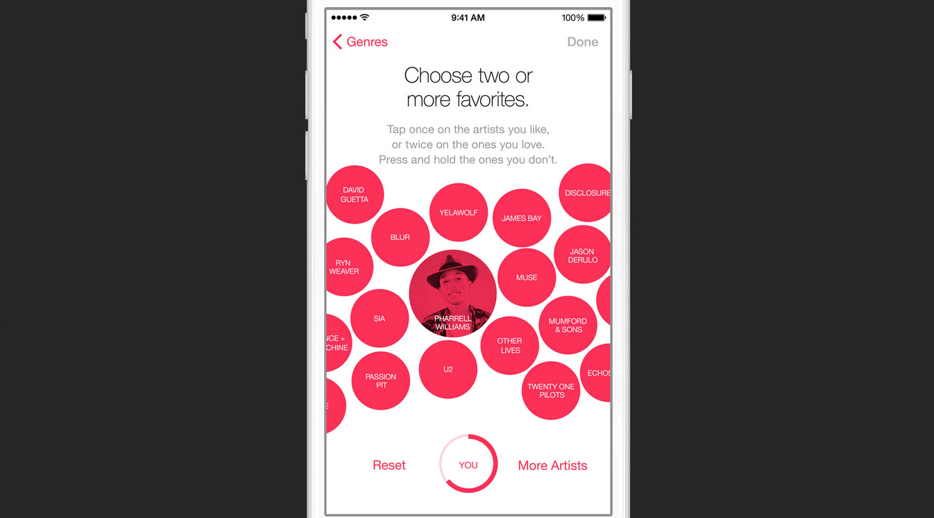 全新的 Apple Music 应用内有 5 个 Tab,For You、New、Radio、 Connect、和 My Music。其中 For You 是智能推荐服务,首次使用 Apple Music 时需要勾选你的喜好。
