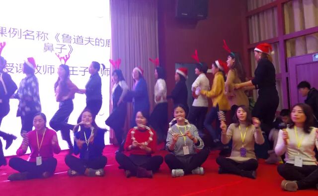 音乐活动《鲁道夫的鹿鼻子》,老师们带上鹿角、圣诞帽,伴随着音乐的节奏,模仿圣诞老人驾着雪橇在雪地上一深一浅地奔走,为小朋友们送礼物的样子,在愉快地音乐游戏中,园长老师们仿佛回到了天真无忧的童年时光,提前过了一个不同寻常的圣诞节。