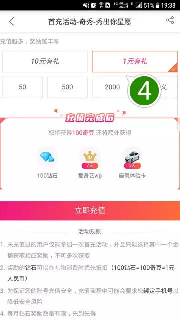 爱奇艺-奇秀直播,未充值过的用户,可享受1元开通7天爱奇艺VIP会员。具体流程如下: