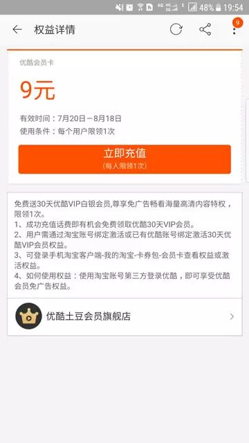 淘宝充值任意金额话费领取30天优酷白银会员: