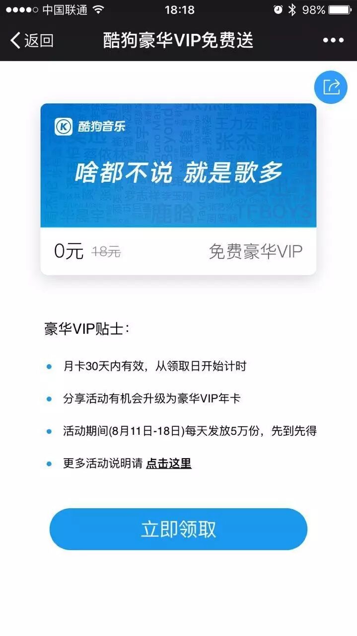 2、【福利升级】成功分享该活动后再领取,更有机会升级为酷狗豪华VIP年卡;