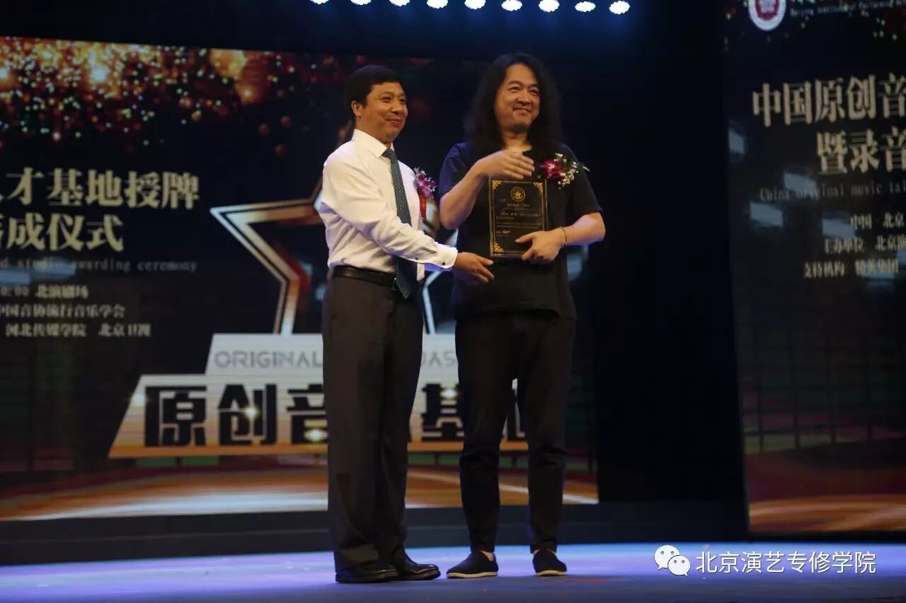 中国音协流行音乐学会常务副会长金兆钧向北京演艺专修学院院长徐进才授中国原创音乐人才基地牌匾