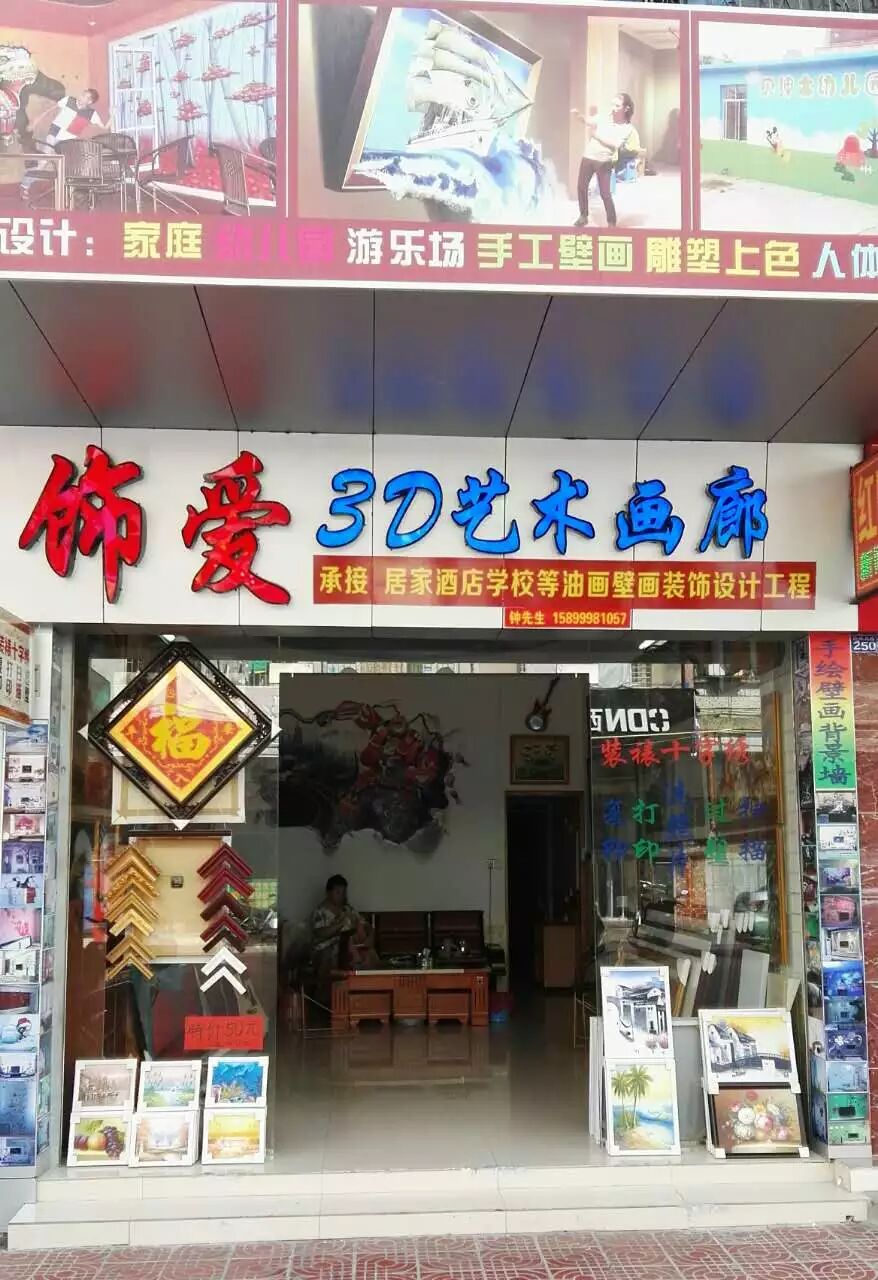 饰爱3D艺术画廊—兴宁首家专业定制纯手工墙绘壁画油画,不管您想要什么样的风格它都能满足你,主要为家庭设计绘制个性的电视,沙发背景墙,儿童房等手绘墙壁画,是一种新兴家庭装饰。