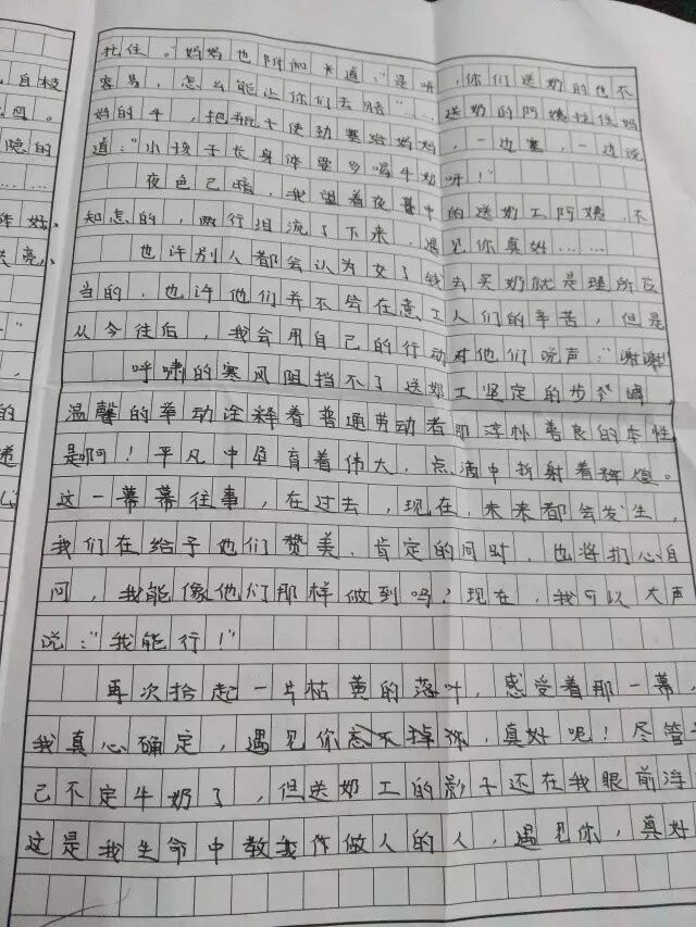 呼啸的寒风阻挡不了送奶工坚定的步伐,温馨的举动诠释着普通劳动者那淳朴善良的本性。是啊!平凡中孕育着伟大,点滴中折射着辉煌。这一幕幕往事,在过去、现在和未来都会发生,我们在给予他们赞美、肯定的同时,也将扪心自问,我能像他们那样做到吗?现在,我可以大声说:“我能行!”