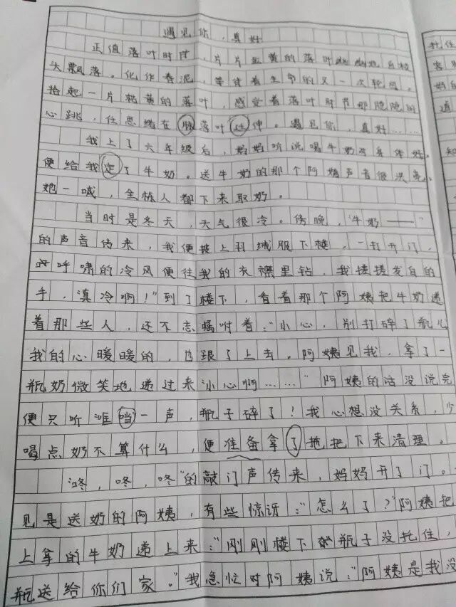 “咚,咚,咚”,敲门声传来,妈妈开了门。一见是送奶的阿姨,有些惊讶:“怎么了?”阿姨把手上拿的牛奶递上来:“刚刚楼下瓶子没托住,这瓶送给你们。”我急忙对阿姨说:“阿姨,是我没有托住,不是你原因。”妈妈也附和着,“是啊,你送奶也不容易,怎么能让你去赔。”送奶的阿姨拉住妈妈的手,把奶瓶使劲塞进妈妈手里,一边塞一边说:“小孩小长个子,要多喝牛奶。”