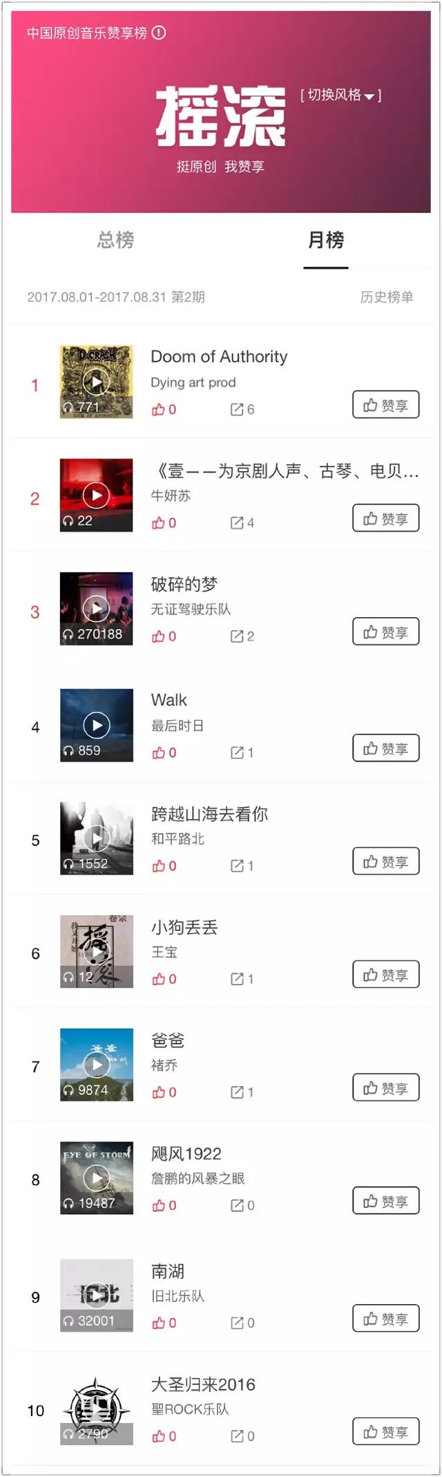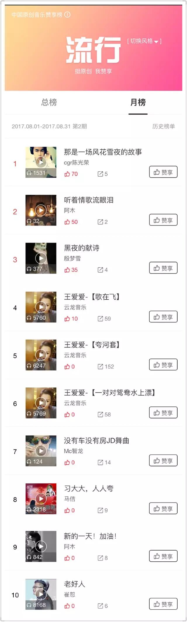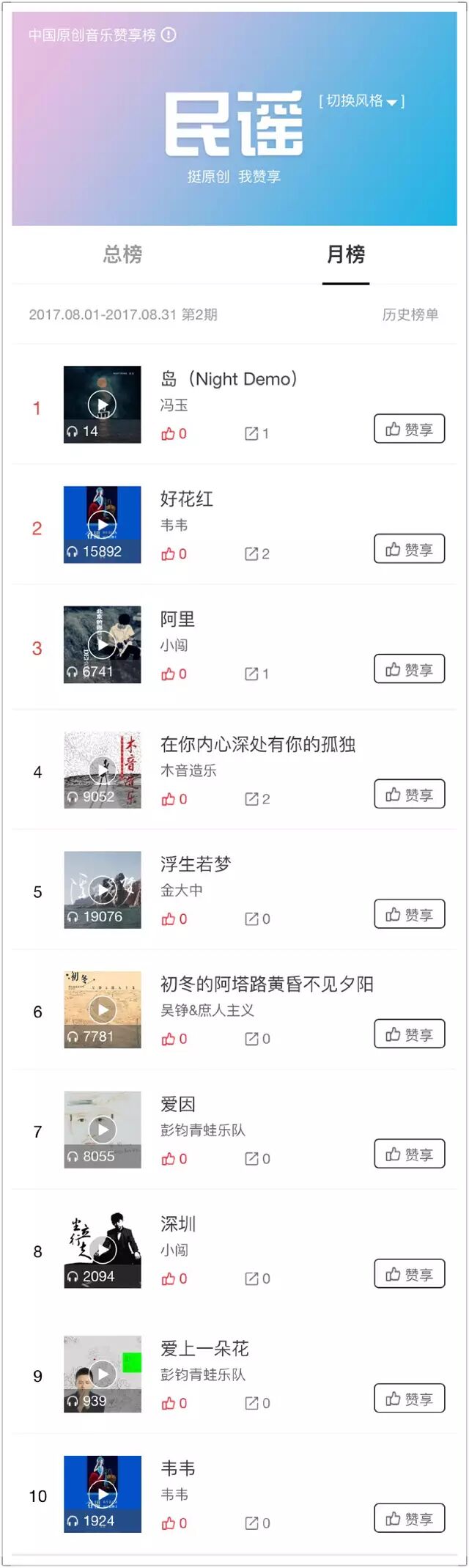 中国原创音乐赞享榜2017年8月第2周榜单公布