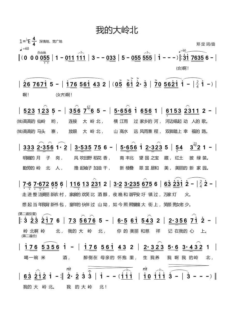 《我的大岭北》曲谱经国内知名歌唱家(略名)修改,旋法已然成熟。经我县“东江源”合唱团成员张晓清试唱后,形成了稳定的民族歌曲风格。赣籍广东音乐家舒一夫先生为歌曲伴唱声谱进行了二次创作,并倾力编曲,分谱级别已达到专业乐团演奏的分部编配要求。2017年7月,歌曲由广州女高音歌手智丹演唱、由一夫音乐传媒合唱团伴唱录音制作完成。为增加本土元素,歌曲增加了定南县本土优秀歌手朱俐华演唱和本县录音制作版本,各版演唱均字正腔圆,感情真挚,韵味十足,富有特色。这首歌还得到了中山市合唱团著名指挥萧洒先生的高度认可,音乐家罗晓航也给予好评。