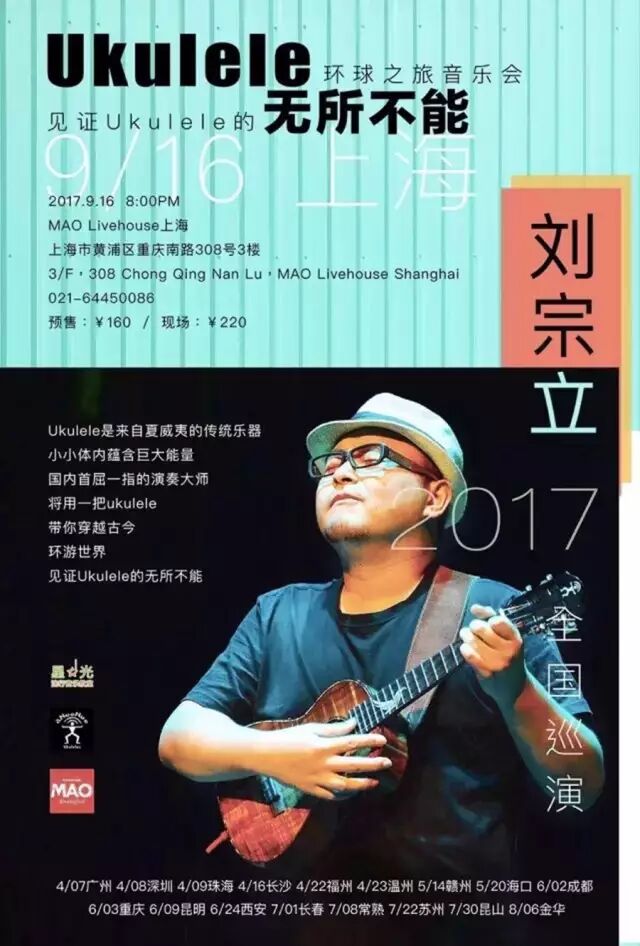 国内首屈一指的Ukulele指弹独奏大师刘宗立将于2017年9月16日在上海Mao Live House带来Ukulele环球之旅全国巡演的第18站,一个人用一把琴为你呈现Ukulele的无所不能,让你感受到小小琴体内蕴含的巨大能量,颠覆你对Ukulele的看法!