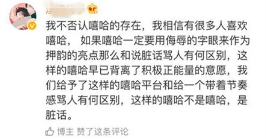 任何一种音乐形式,不论是嘻哈还是流行、摇滚、民谣等等,最重要的是情感共鸣。嘻哈音乐虽然有它独特的气质和内核,但是不代表就可以低俗无底线。如果一味放任自流,只会助长它低级趣味的气焰。