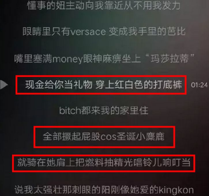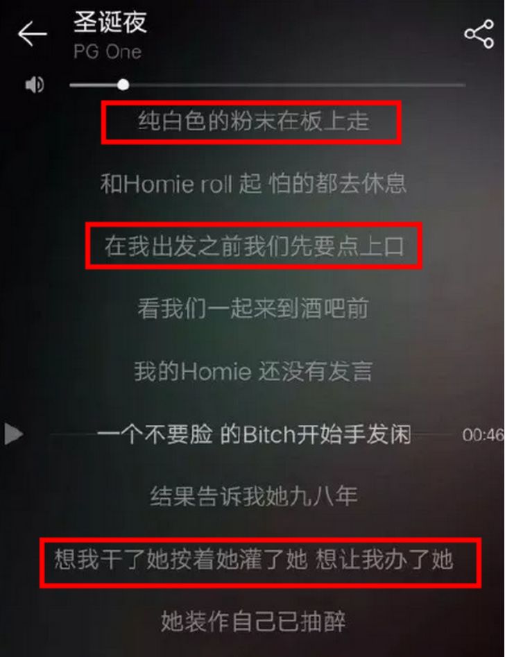 据悉,在PG ONE的歌曲《圣诞夜》歌词中,出现“纯白色的粉末在板上走”“出发之前要先点上口”等涉嫌诱导吸毒的信息,以及“办了她”“全部撅起屁股”“骑在她肩上”等明显歧视侮辱女性等内容。