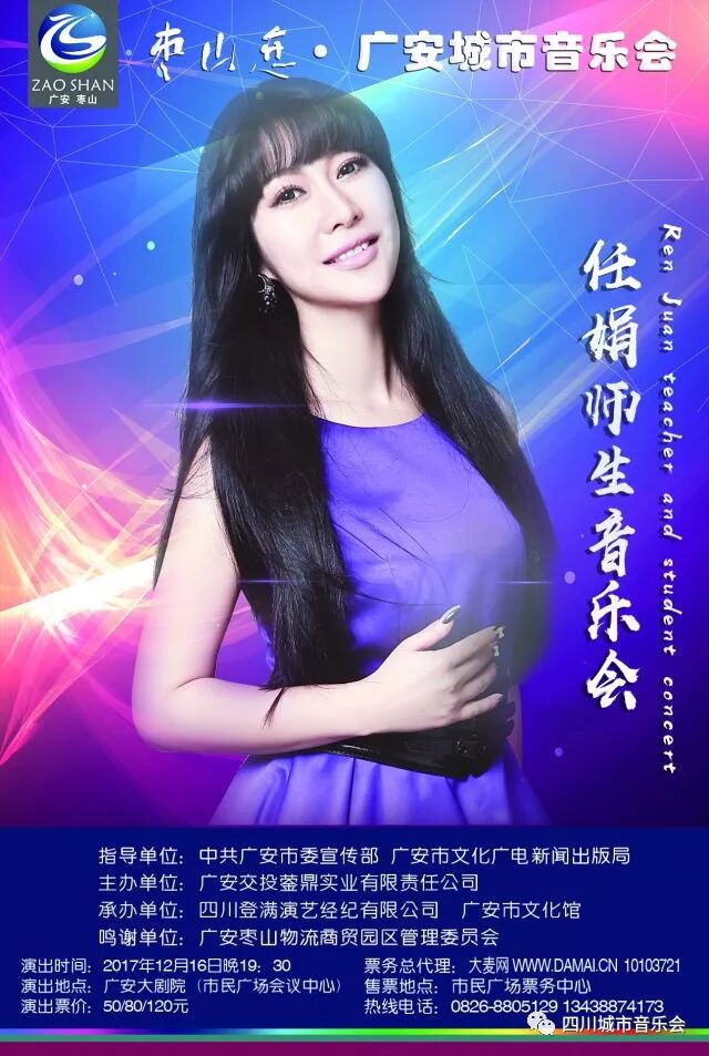 12月16日,“枣山恋-广安城市音乐会”任娟师生专场音乐会将在广安大剧院拉开序幕。在现场任娟老师将和她的学生们一起为大家献上精彩纷呈的演出,演唱风格丰富多元,绝对是不可错过的一场音乐会,打着节拍哼着歌,是你想象不到的惬意,还在等什么呢,一起来啊。演出当天还有位特邀嘉宾 - 男中音歌唱家唐填,是北京国家大剧院签约演员,成都艺术剧院独唱演员。先后师从于四川音乐学院声乐系杨列京教授,中央音乐学院声歌系袁晨野教授。