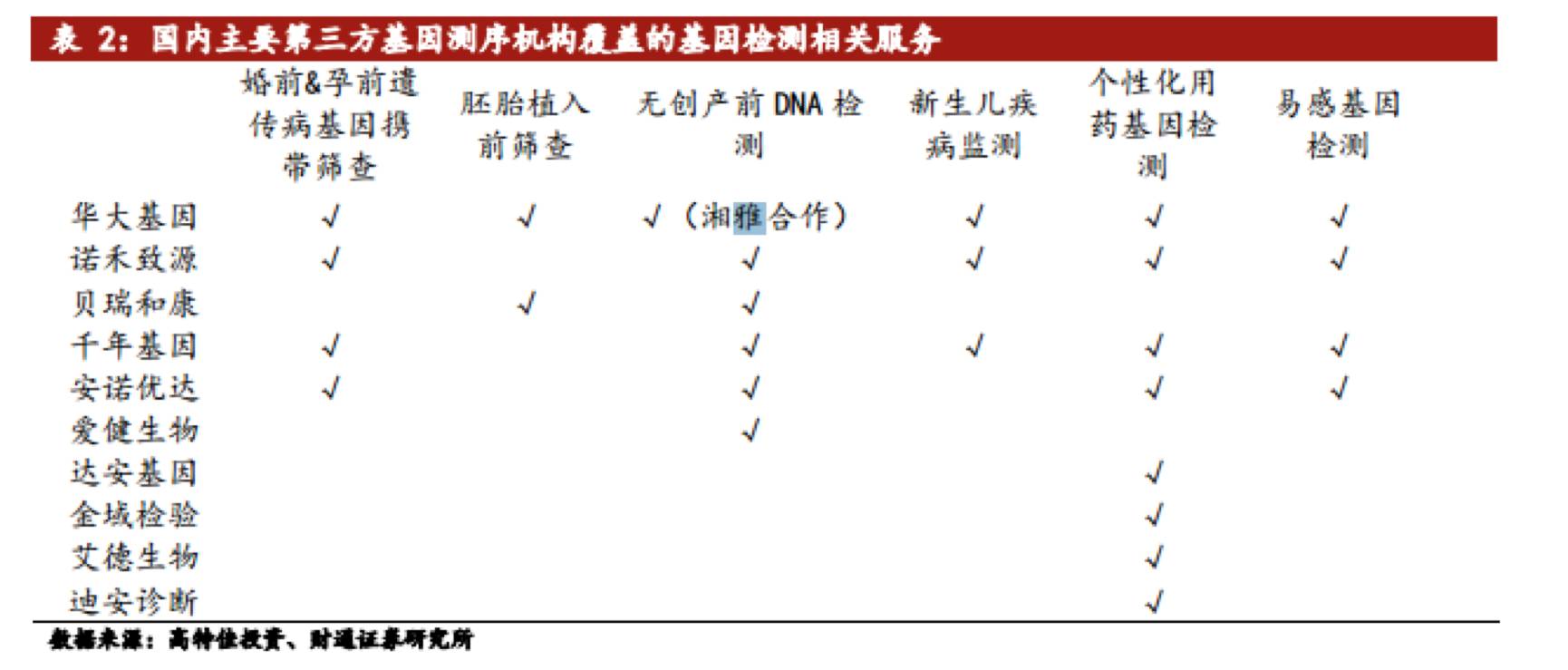 2. 基因测序提供商的竞争:华大基因作为基因测序与检测服务提供商,主要面对来自基因测序提供商的竞争。其中,面向基础研究的基因测序服务提供商主要为大型基因组学实验室和大型测序服务公司,如华大基因、诺禾致源、药明康德;面向终端用户的临床、医疗类的基因检测服务提供商主要为医学独立实验室(如金域检验、达安基因、华大基因、迪安诊断、艾迪康等)和医疗机构(即医院自行开展基因检测服务)。(财通证券20170705)