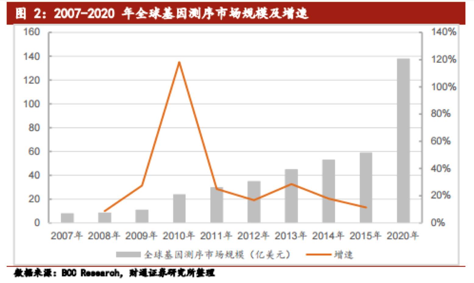 1. 全球基因测序产品市场规模 2015年达到 59 亿美元,2020 年预计达到 138 亿美元,五年的年均复合增长率预计为 18.7%。美国目前每年平均做 500 多万人次的基因检测,创造 30 亿美元的产值。欧洲及其他发达国家和地区的基因检测工作也在迅速升温。中国的基因检测工作基本上与发达国家同步,预计将形成 100 亿元的市场容量。(财通证券20170705)