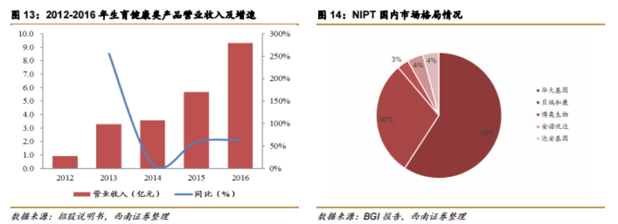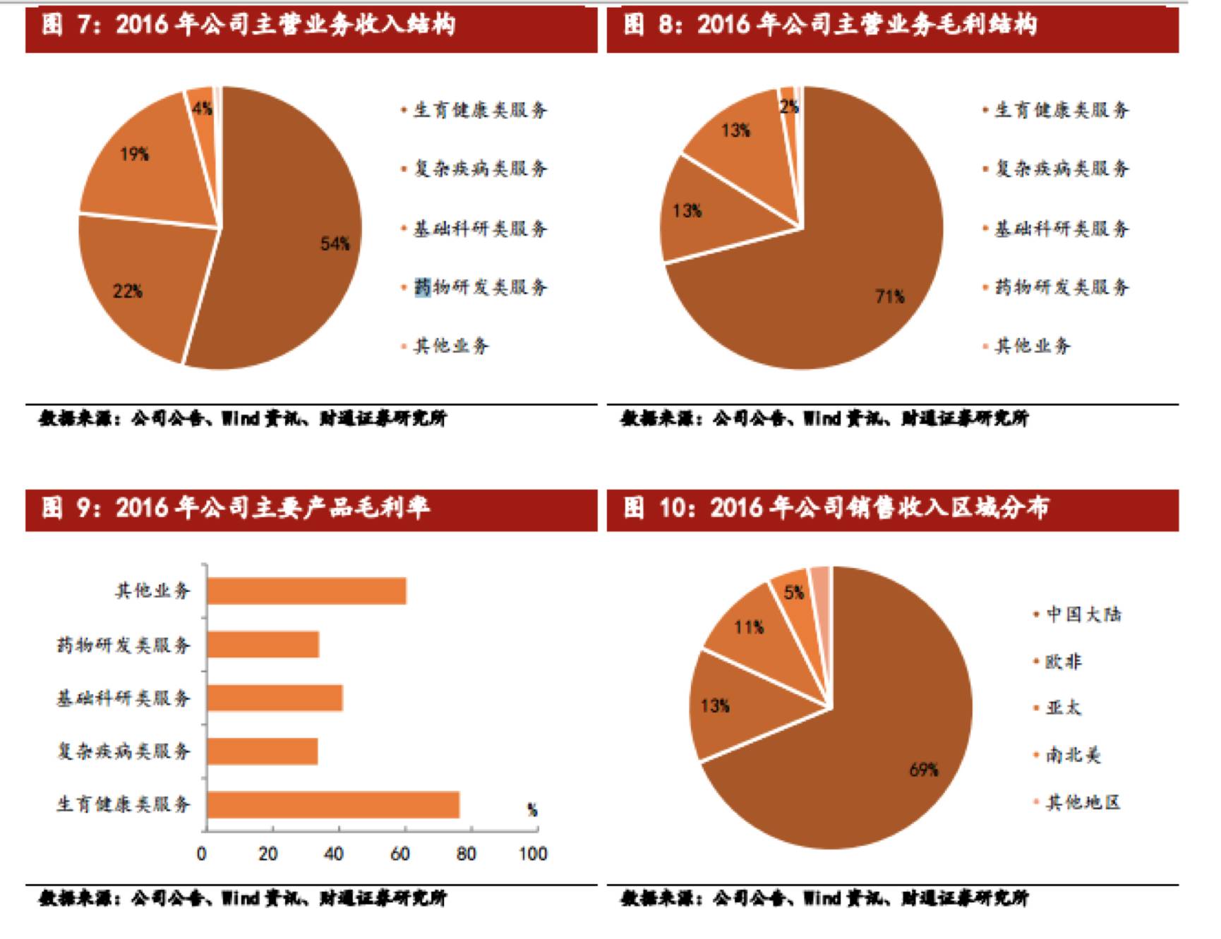 1. 从收入结构看:生育健康类、基础科研类和复杂疾病类合计收入达93%。其中生育健康类服务收入占比逐年提升,2016 年占比达55%,成为收入贡献最多的业务。