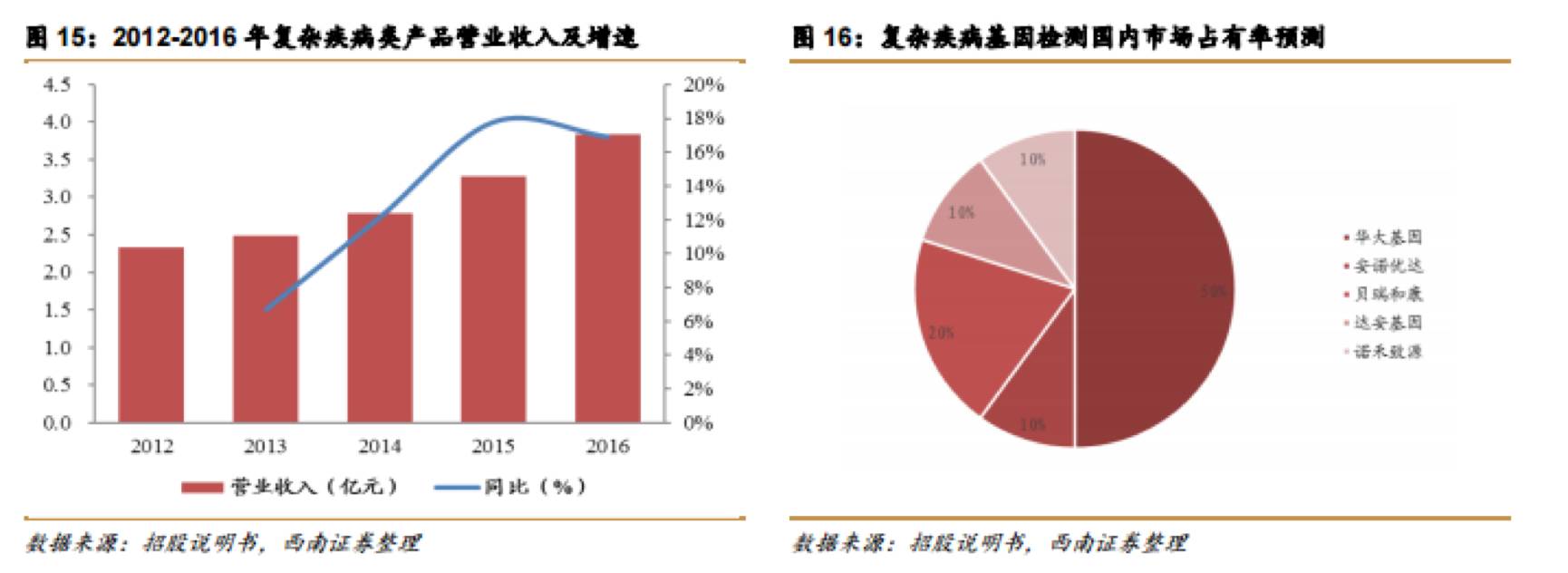 3、复杂疾病基因检测、肿瘤致病机理和相关基础研究、遗传 学肿瘤基因检测、肿瘤常规个体化用药基因检测、肿瘤个体化用药指导系列基因检测。该市场在国内刚刚起步,2012-2016 年复杂疾病类服务营业收入呈稳步增长趋势,年复合增速达 10.5%。(华泰证券20170705)
