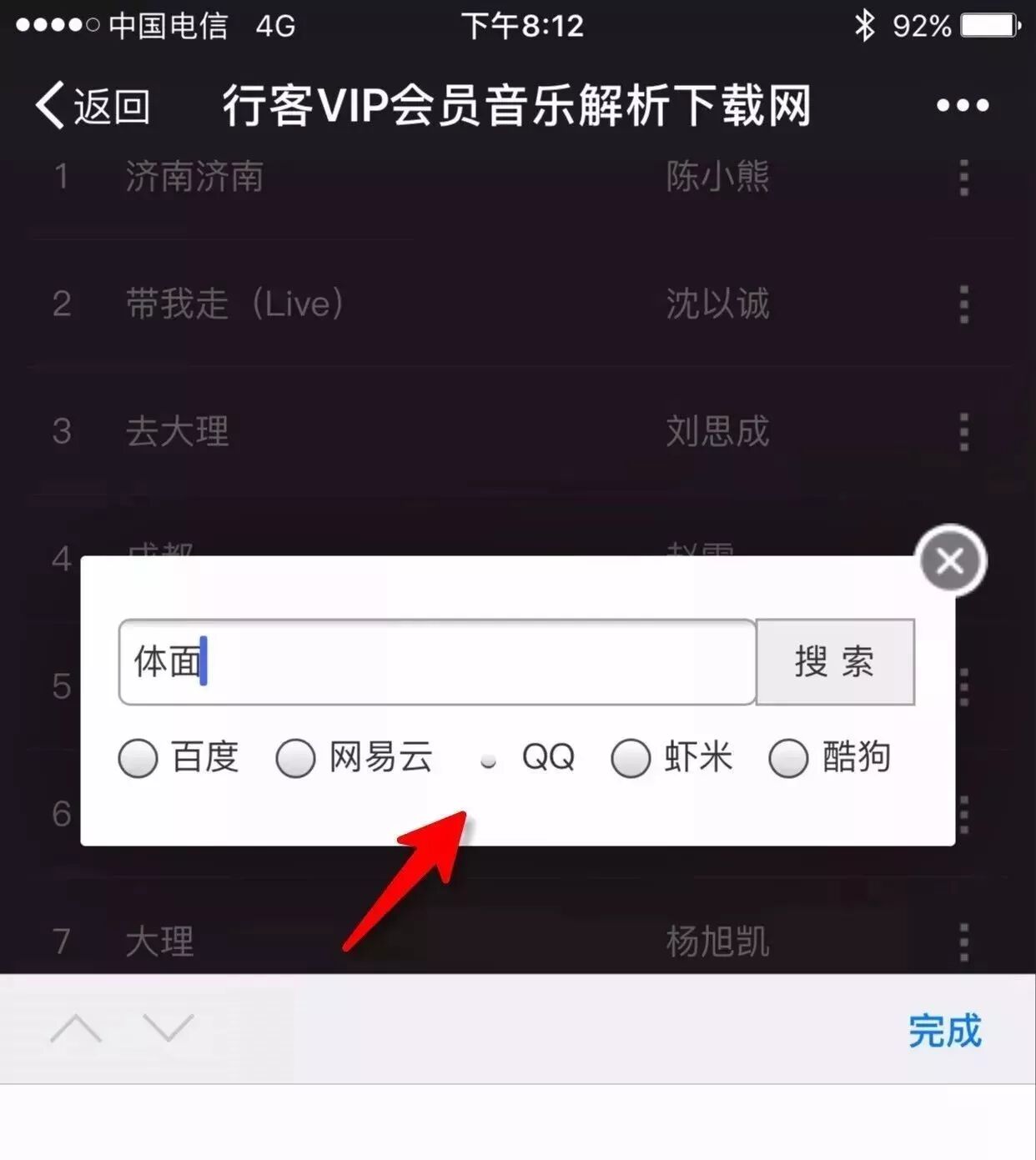 emmmm~ 就拿最近很火的 体面 这首歌来测试吧,我们搜索这首歌,但一定记住要点击下方的音乐源,意思就是说这首歌哪里有你就去选择。譬如说体面这首歌曲在qq音乐中拥有版权。我们选择它,之后点击搜索
