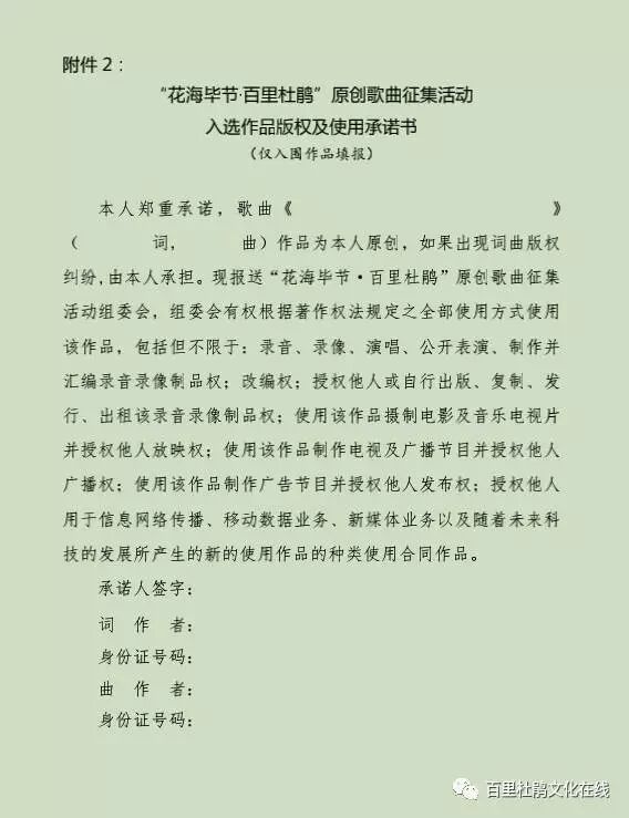 2、“花海毕节·百里杜鹃”原创歌曲征集活动入选作品版权及使用承诺书。