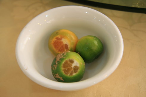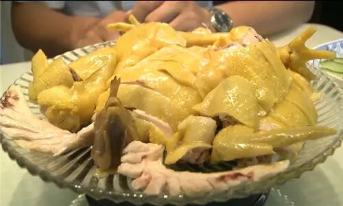 白切文昌鸡除了皮爽肉嫩外,骨髓里还要带有一点血丝。要煮出这样的鸡,火候很有讲究。其中一个秘诀就是:——7上8下。