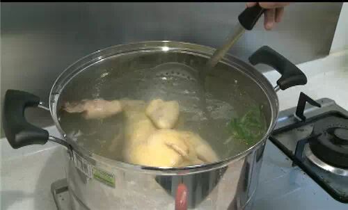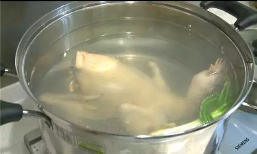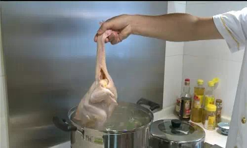 在刚刚水开的时候就要把鸡先放进开水里吊一下,抓住鸡头,放进去泡一下再拿上来一两秒钟,这样反复7上8下,第8下就直接下锅。文昌网微信号:iiwenchang (长按微信号可复制)。这样做的目的是使鸡皮均匀收缩,煮后皮不会爆开。