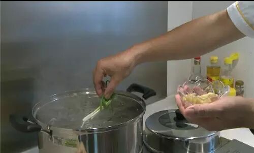 我们先把火烧开,在水中加一些盐、姜片和葱结。注意,水量一定要能没过鸡。