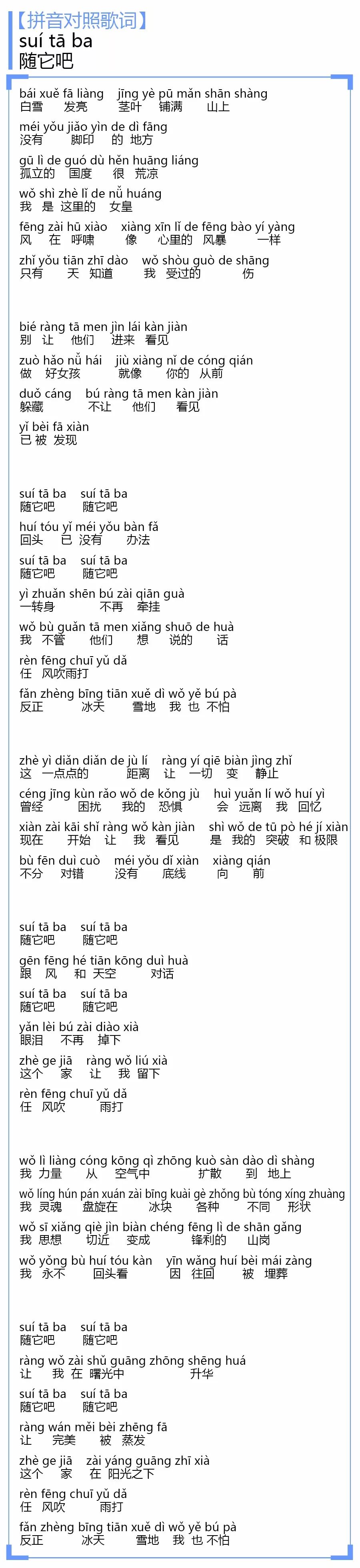 《随它吧》是姚贝娜演唱的,是电影《冰雪奇缘》国语版主题曲(插曲)。