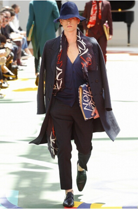 作为作家和探险家的Bruce Chatwin是Burberry2015春夏男装系列的灵感缪斯。模特们头顶的软呢帽是Bruce Chatwin在旅行时必备的单品,手上拿的大牛皮笔记本是最好的采风写生记录,就连风衣上也写满了“冒险”、“探索”等字眼。品牌设计总监Christopher Bailey对这样的搭配定下的结论是:你不应该在工作时身着这套Look,而是学会用漫不经心的穿衣搭配来展现你对生活的态度。秀场上的一切都像是梦回到日不落帝国的大航海时代……