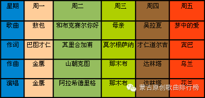 《蒙古原创音乐排行榜》节目本周(1月26日—1月30日)上榜的五首歌曲分别来自伊犁歌手金鹰演唱的《敖包》